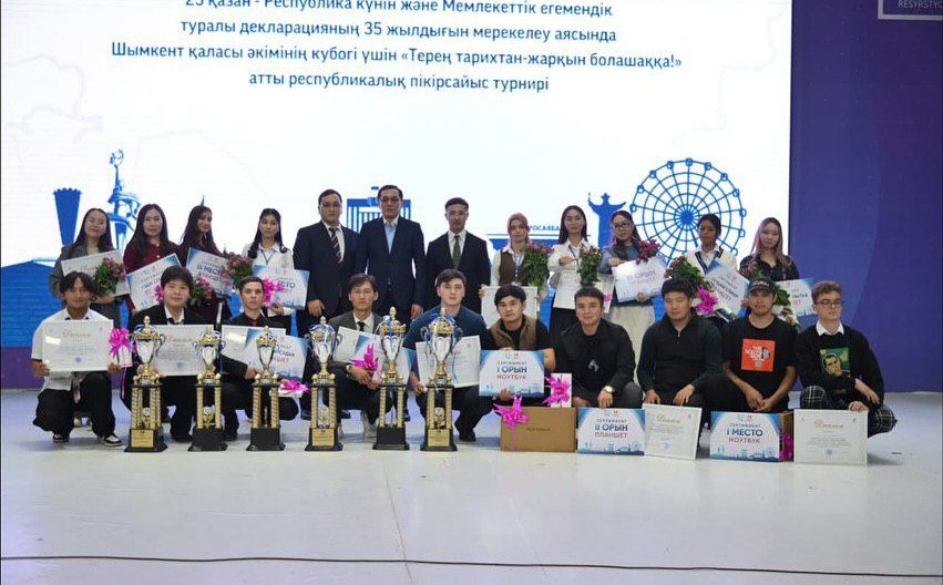 Екі күн алдын Шымкент қаласында басталған пікірсайыс турнирінің жеңімпаздары бүгін салтанатты түрде марапатталды. Республика күні мен Қазақстан Республикасының мемлекеттік егемендігі туралы декларацияның қабылданғанына 35 жыл толуына орай ұйымдастырылған «Терең тарихтан – жарқын болашаққа!» атты республикалық пікірсайыс турнирі жоғары деңгейде өтті.